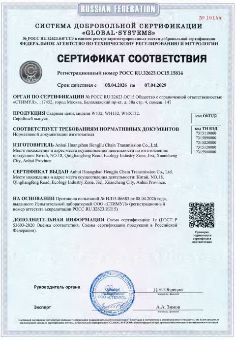 Kürzlich haben die Schweißketten unserer Marke „Huangshan“ nach einer strengen, mehrdimensionalen Prüfung die russische GOST-Konformitätszertifizierung erfolgreich erhalten. GOST ist ein in Russland und den GUS-Staaten verbindlicher nationaler Standard, der zentrale Betriebsbedingungen wie Materialtragfähigkeit, Hochtemperatur-Ermüdungsbeständigkeit, Nahtfestigkeit und Korrosionsbeständigkeit im Außenbereich prüft. Er stellt eine wichtige und anspruchsvolle Voraussetzung für industrielle Antriebsketten dar, um auf dem osteuropäischen Markt für grenzüberschreitende Anwendungen Fuß zu fassen.
